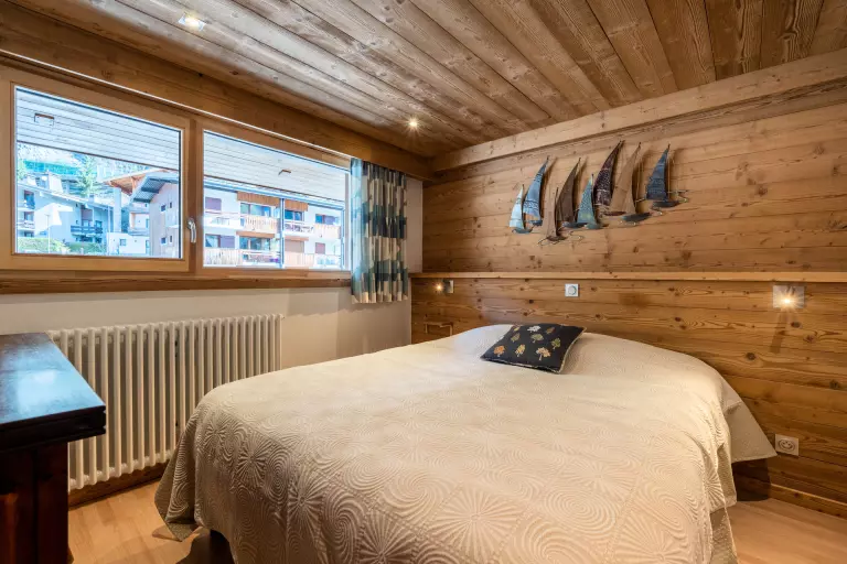 - CHAMBRE (8.94 m²) : 1 LIT 2 PLACES (140), baie + porte fenêtre, accès balcon sud, vue résidences voisines / pistes / montagne