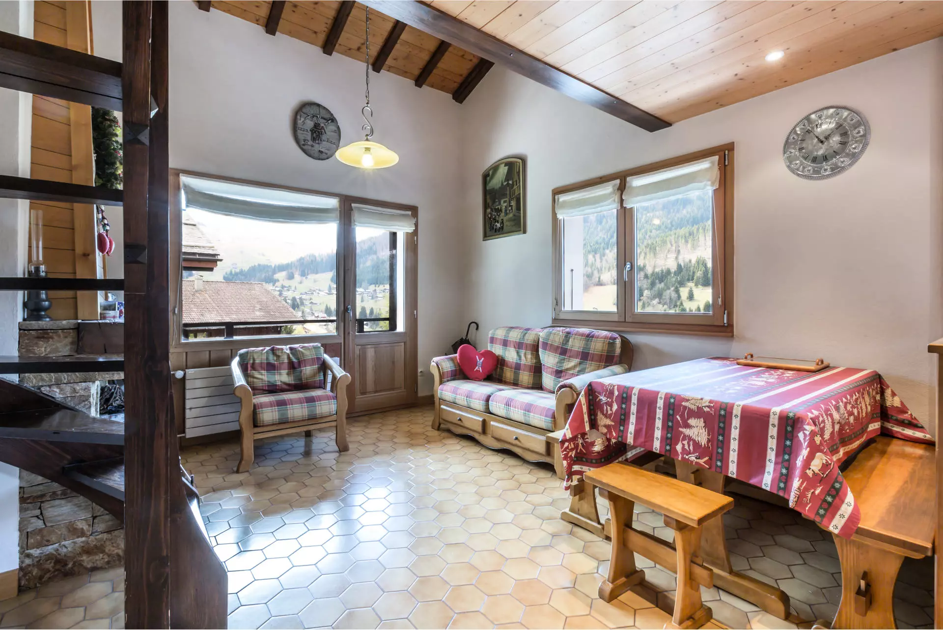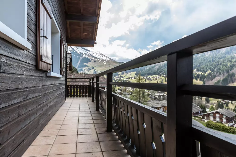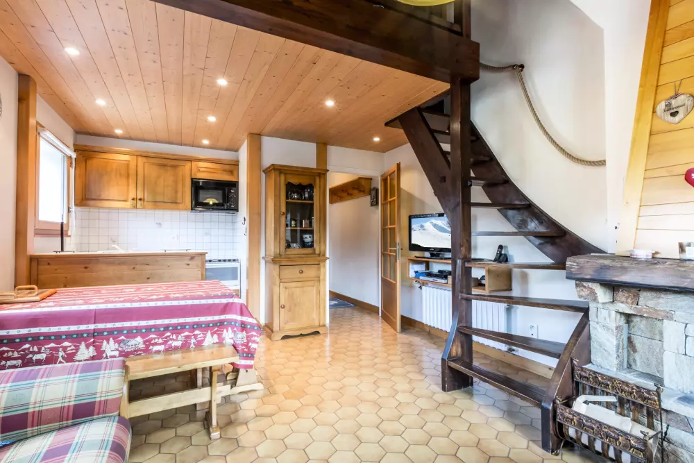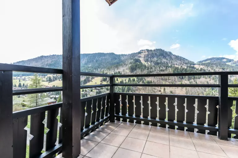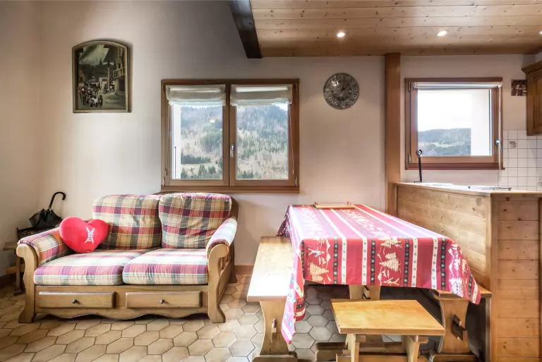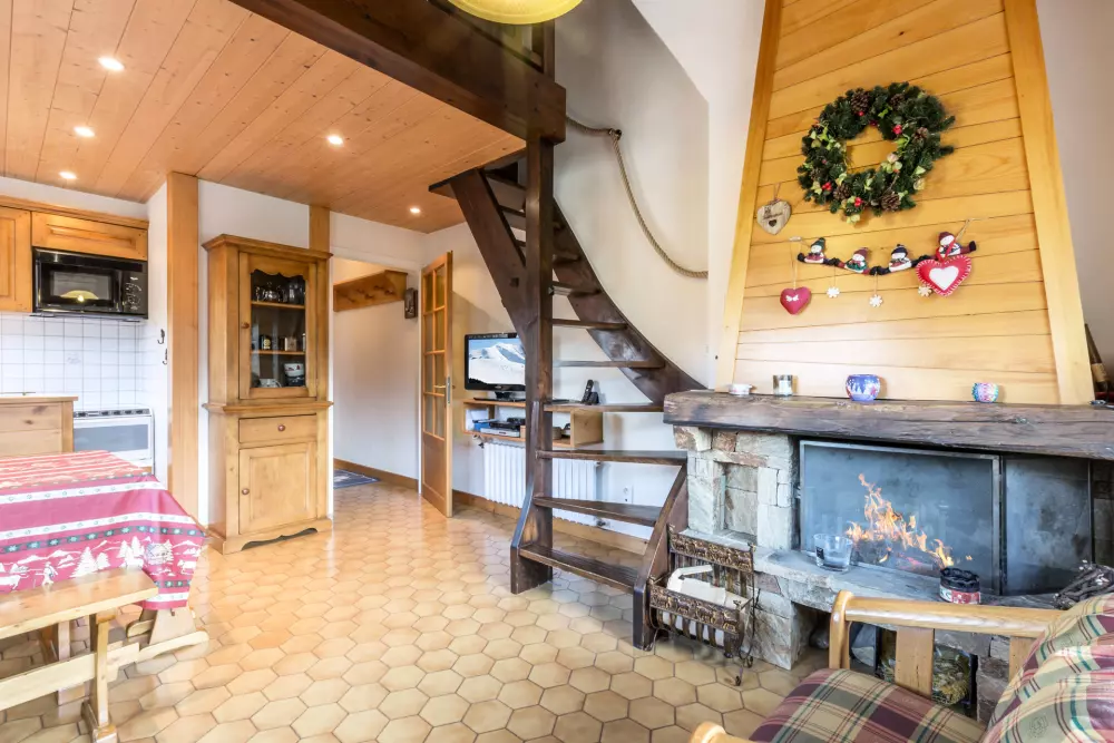 - SEJOUR (18.88 m²) : coin repas, TV écran plat, CHEMINEE, fenêtre ouest vue vallée des Aravis / montagne, baie + porte-fenêtre, balcon d'angle sud ouest, vue résidence voisine / montagne