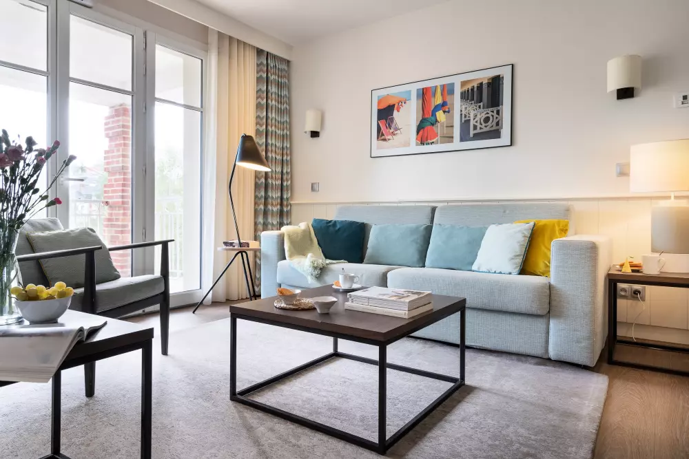 La résidence porte fièrement ses cinq étoiles en affichant une architecture typique à colombages. L'atmosphère balnéaire se prolonge à l'intérieur de votre appartement lumineux et fonctionnel avec des teintes bleues, tout en élégance normande. Vous vous décontracterez comme rarement, en vous installant sur votre balcon ou votre terrasse afin de prendre le soleil et contempler la vue sur les jardins ou la piscine.