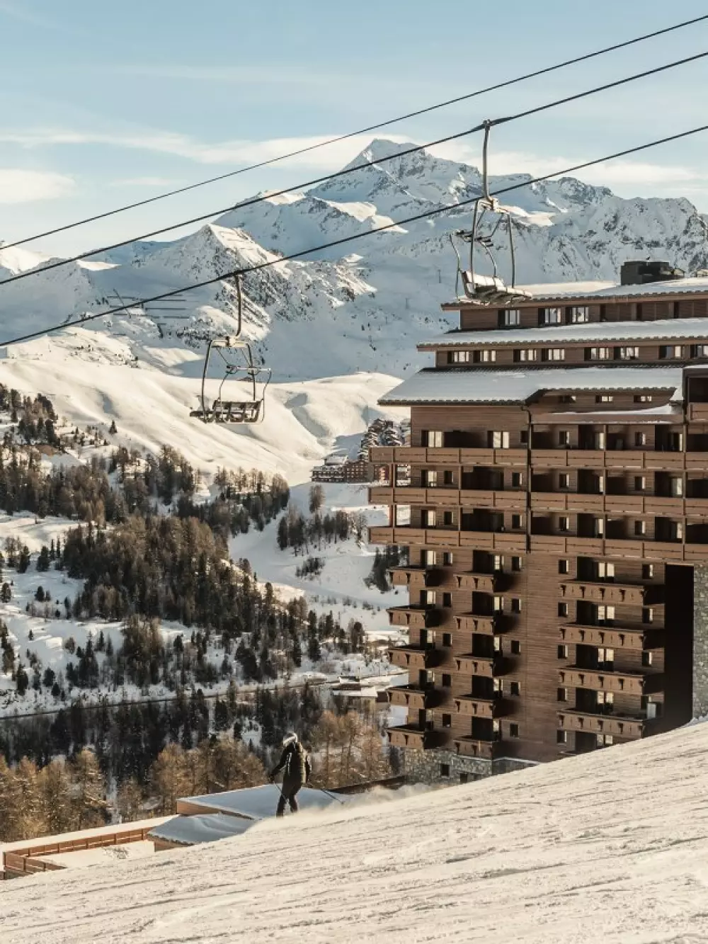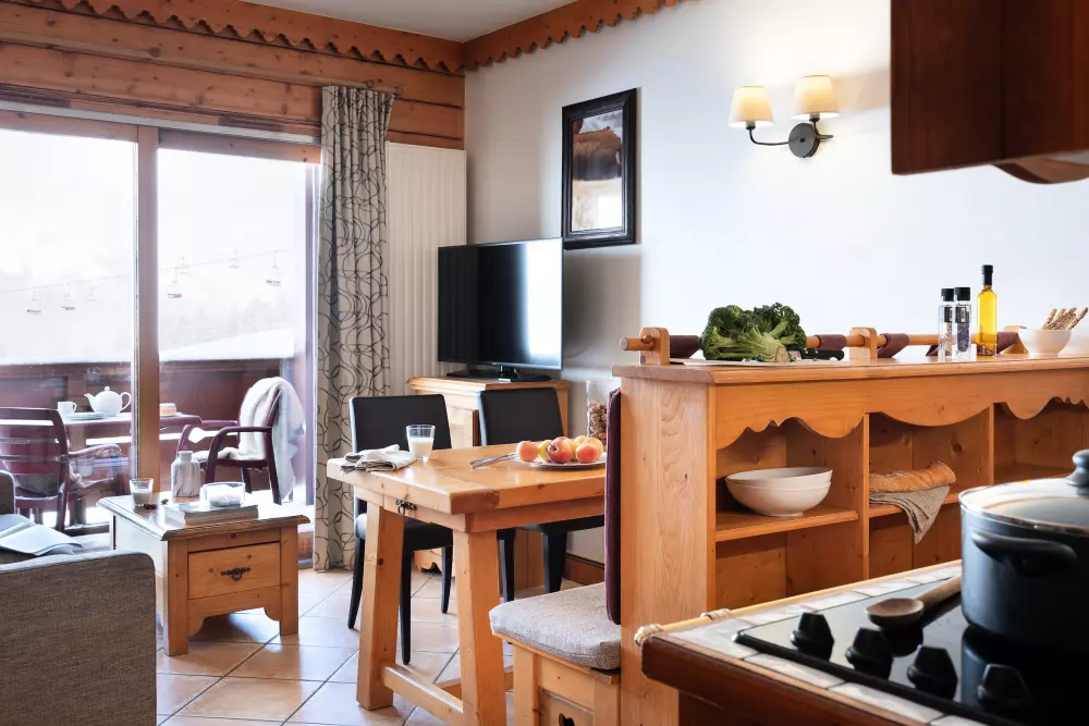 Le Mont-Blanc trône dans ce paysage grandiose. Un spectacle magique dès le lever. Imaginez un nid douillet à la décoration boisée, mélange harmonieux de lignes modernes et de matériaux naturels. Les appartements sont de vrais cocons où vous pourrez partager des moments en famille.