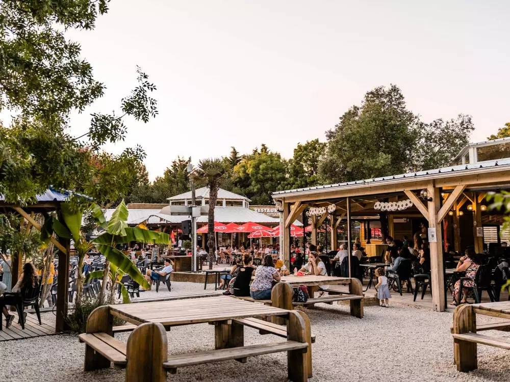 Mer et Soleil possède un village tout en bois avec bar, restaurant, épicerie, salle de jeux électronique et salle de billards, scène d'animations. Au restaurant large choix de plats, brasserie, pizzeria, carte et menus, sur place ou à emporter.