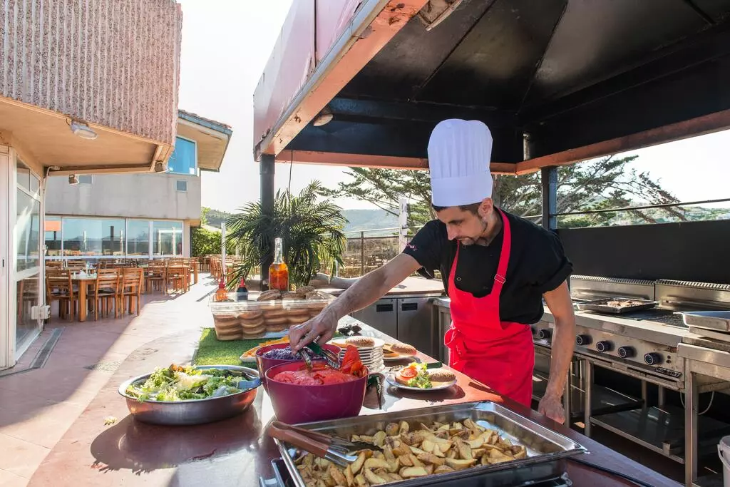 Déjeuner et dîner : service en bu? ets, vin inclus, plus de 20 ingrédients en Salad'bar, salades composées, entrées chaudes, 3 à 4 plats chauds au choix (selon saison) dont un plat végétarien, un pasta'bar, bu? et de fromages et desserts.
